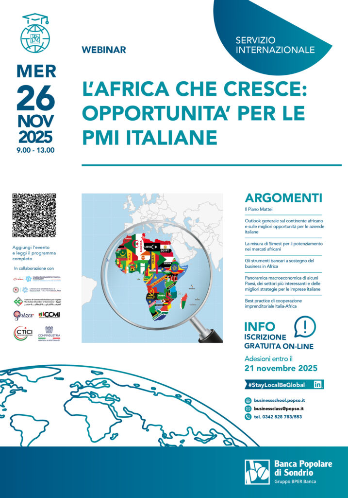 Il 26 novembre si terrà il webinar "L’Africa che cresce: opportunità per le pmi italiane" organizzato dalla Banca Popolare di Sondrio, in collaborazione con Confindustria Assafrica & Mediterraneo, volto a far conoscere alle aziende italiane le tante opportunità di business e di investimento nel Continente Africano. L'evento approfondirà diversi temi, tra cui il Piano Mattei, la misura di Simest per il potenziamento nei mercati africani, gli strumenti bancari a sostegno del business in Africa e i settori più promettenti per le imprese italiane nel Continente. Le aziende interessate, possono registrarsi gratuitamente al seguente link entro il 21 novembre: https://businessschool.popso.it/Landing/businessschool.popso.it/schedaDettagliCorso.aspx?idCorso=1551&conIscrizione=true&aula=Webinar&idEdizione=1319&idEvento=175&idQuestIscr=null&nomeCorso=L%E2%80%99Africa%20che%20cresce:%20opportunit%C3%A0%20per%20le%20PMI%20italiane&eventoPassato=false