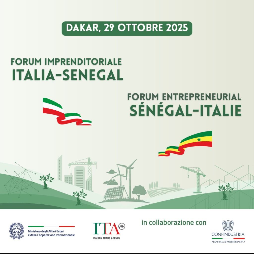 Il Ministero degli Affari Esteri e della Cooperazione Internazionale organizza il Forum Imprenditoriale Italia-Senegal che si terrà il 29 ottobre a Dakar, in occasione della visita del Vice Presidente del Consiglio e Ministro degli Affari Esteri e della Cooperazione Internazionale, Antonio Tajani. L’iniziativa, organizzata dalla Farnesina e da Agenzia ICE, in collaborazione con Confindustria Assafrica & Mediterraneo, riunirà imprese, associazioni del mondo produttivo e istituzioni dei due Paesi con l’obiettivo di approfondire opportunità concrete di sviluppo delle relazioni economico-commerciali e industriali fra Italia e Senegal. Il programma prevede una sessione plenaria aperta dal Vice Presidente del Consiglio e Ministro degli Affari Esteri Antonio Tajani e dalle Autorità senegalesi, cui seguiranno gli interventi dei rappresentanti delle agenzie di supporto all’export e agli investimenti. Si svolgeranno quindi tre tavoli tematici con la partecipazione di imprese e associazioni dedicati all’approfondimento della collaborazione nei seguenti settori: 1. Agroindustria: produzione, trasformazione, distribuzione e packaging 2. Infrastrutture fisiche e digitali: trasporti, porti, trattamento dei rifiuti, gestione delle acque, telecomunicazioni 3. Energia ed energie rinnovabili: infrastrutture di produzione e distribuzione Seguiranno un networking lunch e una sessione di incontri BtoB programmati fra imprese italiane e senegalesi. Nella giornata del 28 ottobre Agenzia ICE organizzerà visite aziendali suddivise per i tre settori focus presso alcune realtà/distretti locali. Per maggiori informazioni e per i successivi aggiornamenti saranno resi disponibili sulla pagina dedicata all’iniziativa: EVENTI SISTEMA PAESE - Forum imprenditoriale Italia-Senegal Lingue dei lavori. In Senegal la lingua veicolare é il francese. Sarà garantita la traduzione in italiano per tutte le sessioni seminariali (plenarie e settoriali); per i B2B, saranno disponibili a rotazione alcuni interpreti italiano/francese o inglese/francese.