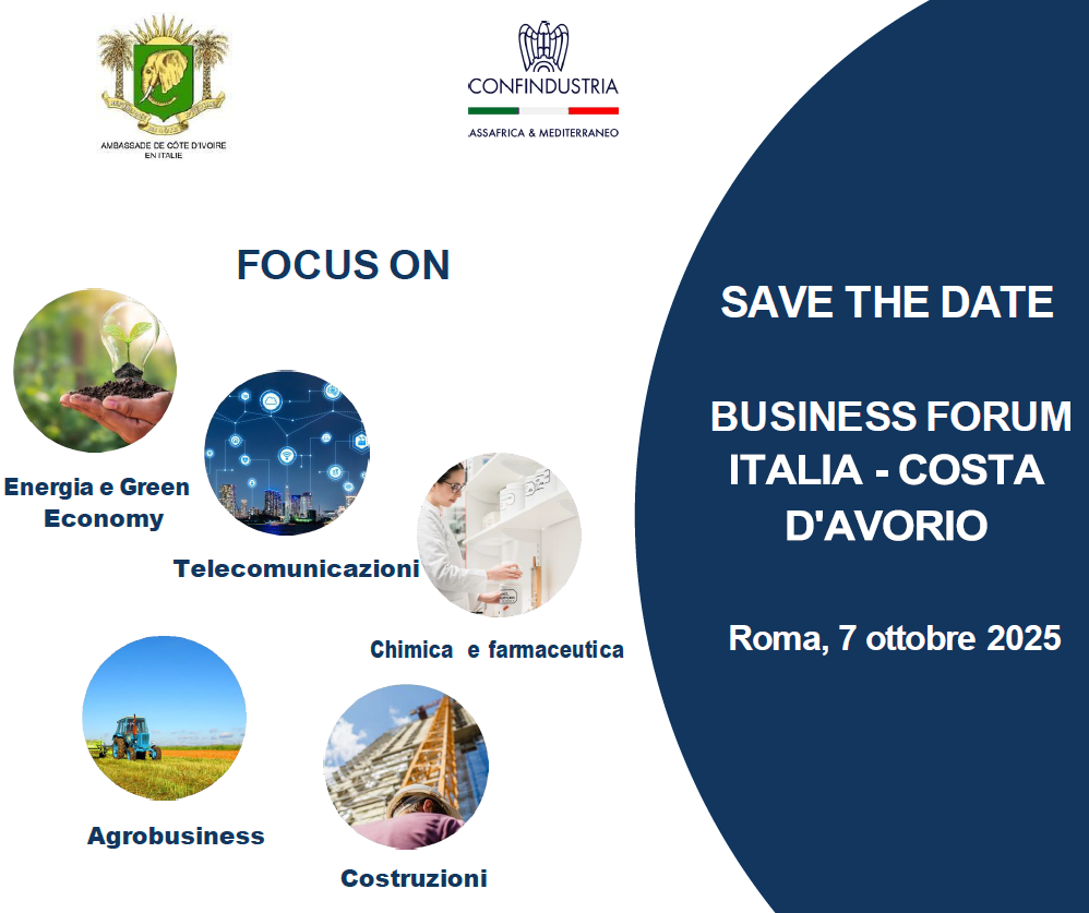 Il 7 ottobre 2025 alle 10.00 si terrà a Roma, il Business Forum «Italie - Côte d'Ivoire», organizzato dall’Ambasciata della Costa d'Avorio in Italia in collaborazione con Confindustria Assafrica & Mediterraneo. Nel corso della mattinata verranno presentate le opportunità di investimento in diversi settori (energia, agricoltura, costruzioni, farmaceutica, telecomunicazioni e digitalizzazione), progetti di partenariato pubblico-privato del Piano di sviluppo del Governo ivoriano e gli incentivi per operare nel Paese. È prevista la traduzione simultanea italiano-francese. Le aziende interessate a partecipare possono scrivere all'indirizzo: f.rossano@assafrica.it